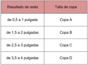 Una vez que ya sabe la medida de su espalda, conoce cuál es su número de copa, rodee con la cinta métrica del busto, justo a la altura de los pezones, mida y convierta a pulgadas. Luego, reste a la medida de su busto la medida de la espalda. Para determinar cuál copa debe usar. Utilice esta guía: