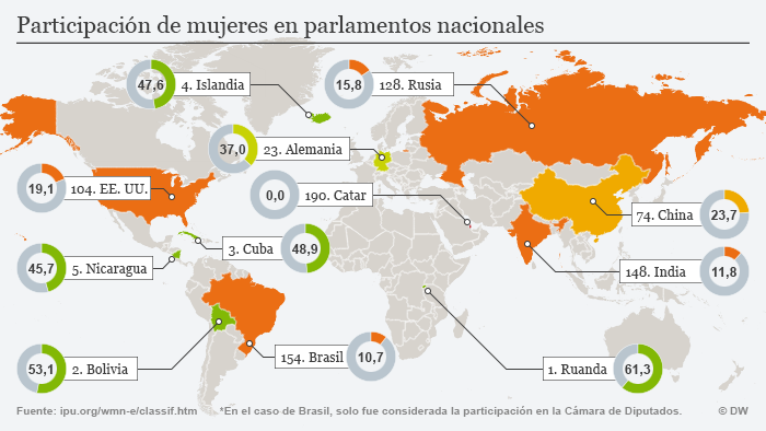 Según estadísticas del 2017 de la Unión Interparlamentaria (UIP), Ruanda, estado africano, es el que lidera con un 61,3% el ránking de los países con mayor participación femenina en los parlamentos nacionales. En el segundo puesto se encuentra Bolivia (53,1%), Cuba en el tercero (48,9%), Islandia en el cuarto (47,6%) y Nicaragua en el quinto (45,7 %).