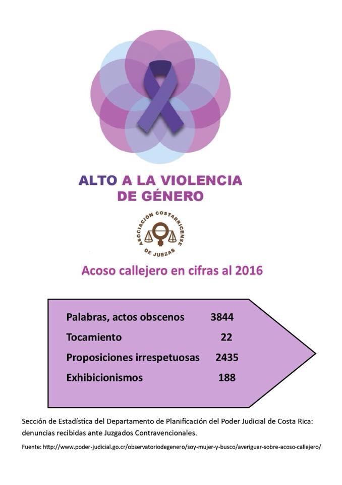 La Asociación Costarricense de Juezas se ha propuesto este año, realizar una campaña, para visibilizar una de las muchas manifestaciones de la violencia contra la mujer, que es el acoso sexual en espacios públicos, también conocido como acoso sexual callejero, del cual la población femenina es su principal víctima.