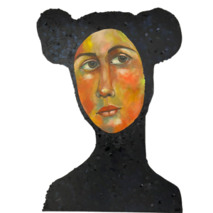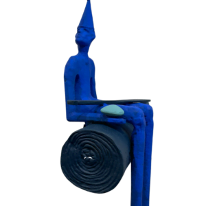 Las esculturas, todas en azul añil, con sombreros de cono, sentadas en la misma posición, pero con diferentes elementos distintivos sobre los regazos, al igual que las pinturas en acrílico sobre tela, evocan la frase de Ortega y Gasset, “yo soy yo y mis circunstancias”.