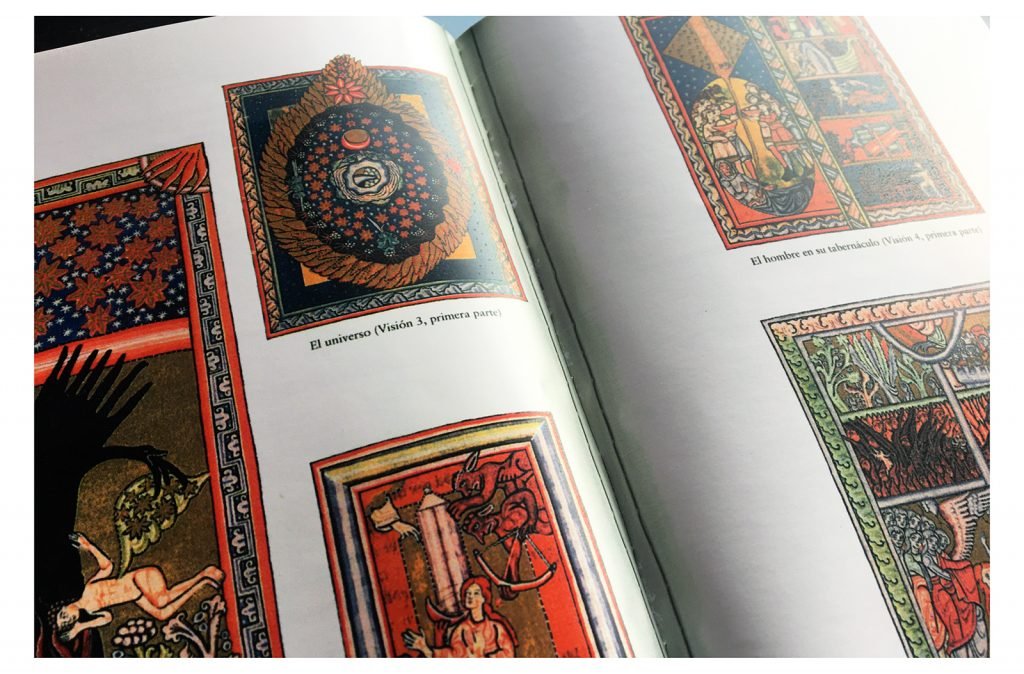 Ella vio una gran figura semejante a un huevo; llamas ardían a su alrededor. Poseía varias capas compuestas por distintos elementos, fuego, las tinieblas, éter, torbellinos, y en el centro, es decir, en la última capa, se encontraba un monte. A una rápida mirada de la ilustración que acompaña los códices más antiguos conservados de esta obra, y que recuerdan a la tradición alquímica, podríamos suponer que el fuego que todo lo envuelve representa la luz divina de Dios, y en la capa más baja se encuentra la morada del ser humano, es decir, la materia, los elementos densos. Después nos va explicando con mayor detalle su visión. Nos dice: