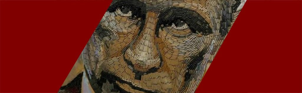 Es la obra de la artista ucraniana Dariya Marchenko, que muestra el rostro del presidente de rusia, Vladimir Putin, conformado por 5.000 cartuchos de armas de fuego.