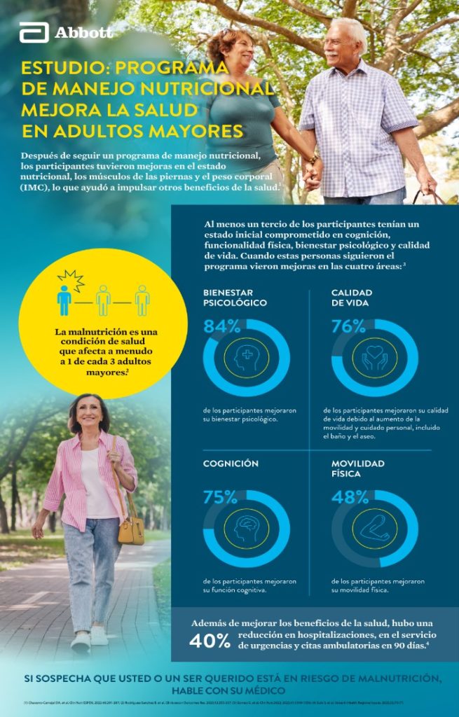 Además de los beneficios nutricionales, el estudio encontró que un programa de manejo nutricional puede tener un impacto positivo en múltiples medidas de calidad de vida3. Eso es especialmente importante para los adultos que desean mantenerse independientes, ya que para envejecer bien el cuidado de la salud en general es clave.