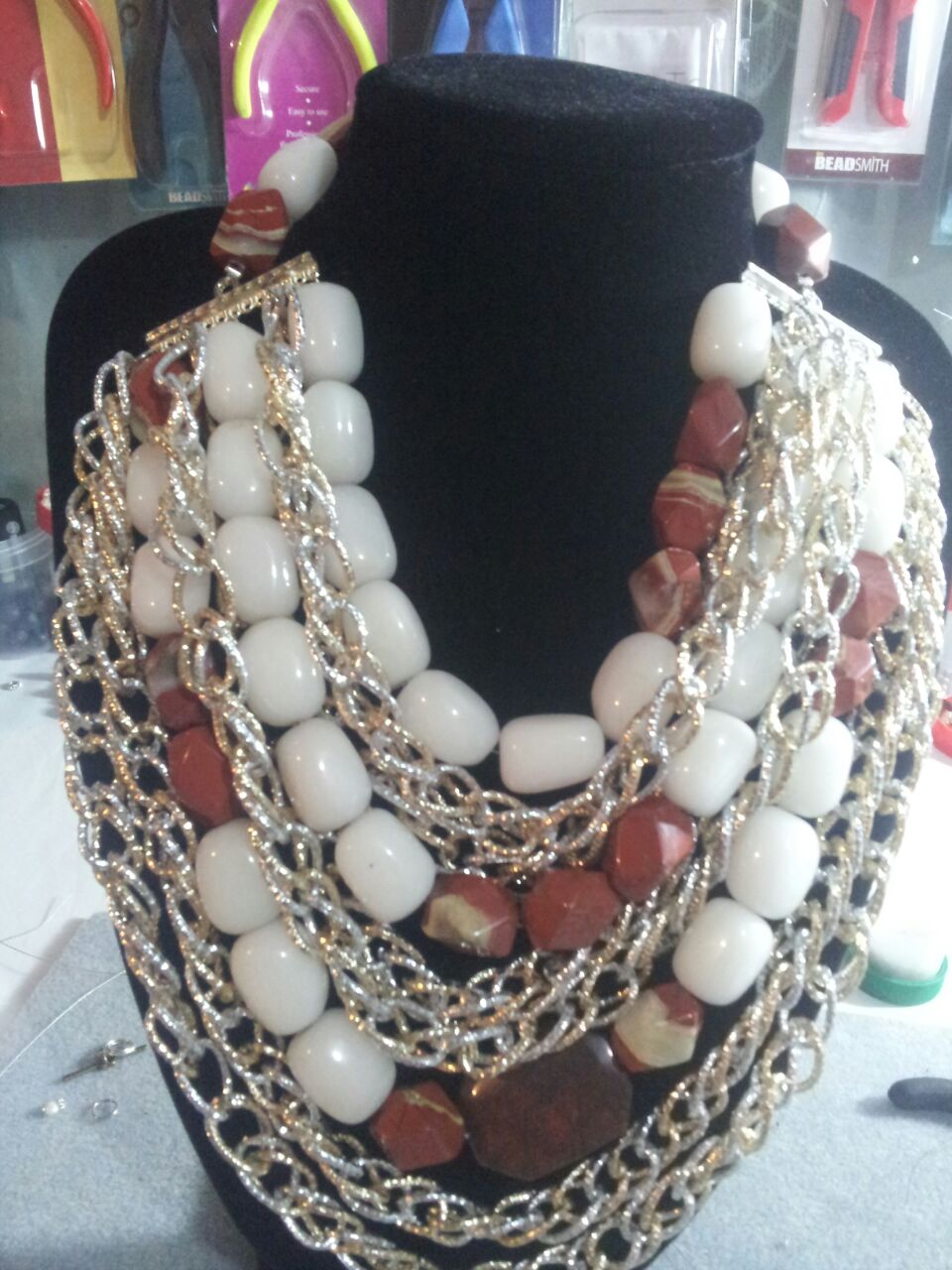 Esta biojoyería también tuvo algunos cambios con el pasar de los años, debido a que algunas clientas comenzaron a solicitarle a Maureen piezas más grandes y extravagantes, como collares de 4 hileras con abundantes piedras y grandes dijes o brusas.