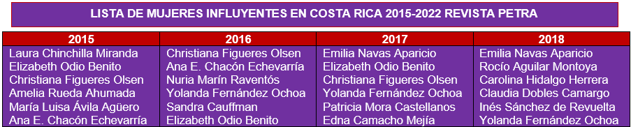De las 38 mujeres que han estado en esta lista desde el 2015 al menos una vez, 22 provienen del sector público, 12 del sector privado, 3 de deportes y 1 de un Organismo No Gubernamental. Elizabeth Odio Benito ha sido la que más se ha incluido en la lista con 7 menciones, seguida de Laura Chinchilla Miranda con 6 y Patricia Mora Castellanos con 5.