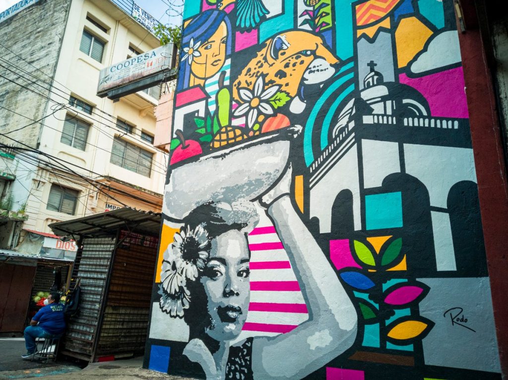 Al respecto, hizo alusión a dos de las figuras que integran el mural: una mujer, sonriente, quien lleva, sobre su cabeza, un canasto colando de frutas, y, más arriba, un jaguar.