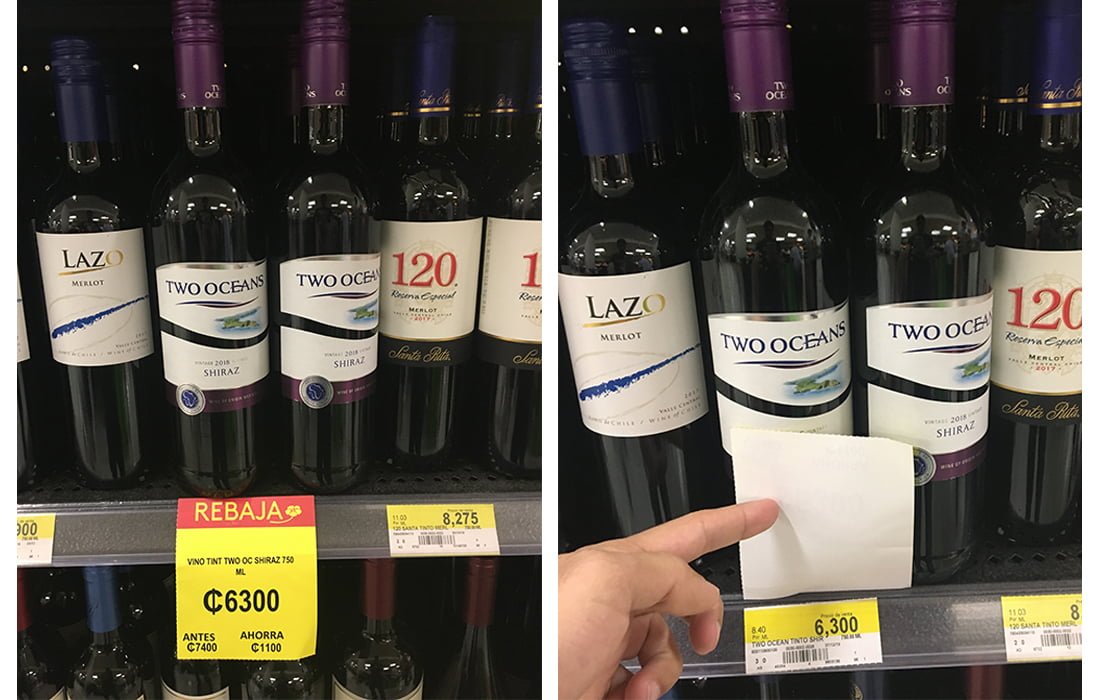 La semana pasada nos dimos a la tarea de comprobar la teoría de mi conocido. Entramos a uno de esos supermercados, de los más populares del Valle Central, y entre los primeros estantes, los que muestran los vinos y licores, pudimos observar un rótulo grande amarillo con letras negras que decían “REBAJA”, y acompañado del número que marcaba la ganga, y abajo, en tipografía más pequeña, la supuesta prueba de la rebaja: “antes”, tal precio; “ahorra”. Ahora bien, basta con levantar el rótulo para revelar el precio que tenía el producto antes de la súper oferta para darnos cuenta de que es exactamente el mismo número de la supuesta rebaja.