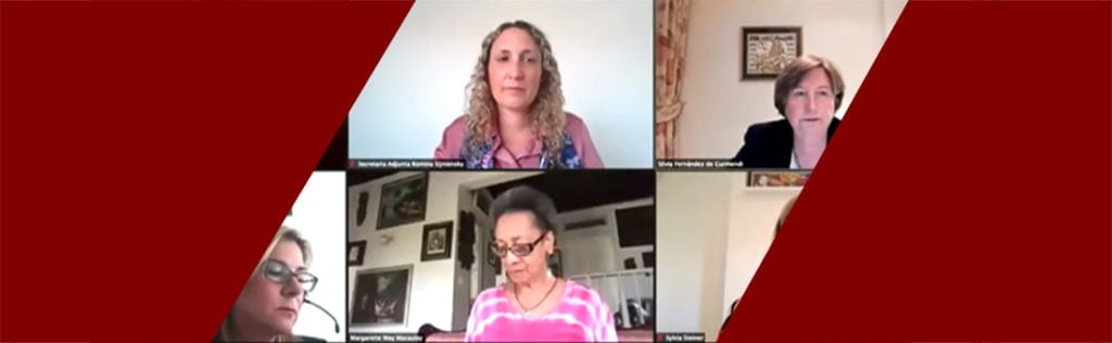 Las panelistas fueron Alejandra Mora Mora, Secretaria Ejecutiva de la Comisión Interamericana de Mujeres; Maria-Noel Vaeza, Directora Regional de ONU Mujeres para las Américas y el Caribe, Vanessa Ruiz, Presidenta de la Asociación Internacional de Mujeres Juezas; Viviana Krsticevic, Integrante del secretariado de la campaña Gqual, y Julissa Mantilla, Comisionada de la Comisión Interamericana de Derechos Humanos. Moderó el panel la Secretaria Adjunta de la Corte Interamericana, Romina Sijniensky.