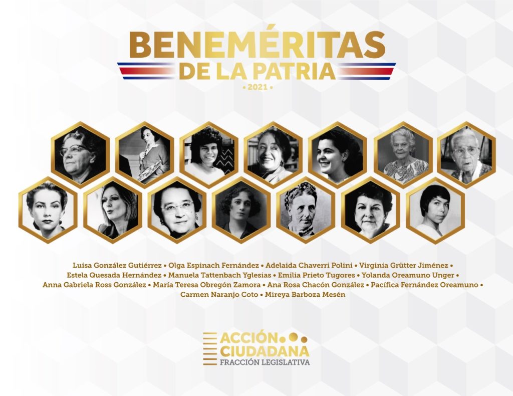 Entre las nuevas beneméritas, figuran líderes feministas de final del siglo 19 y de todo el siglo 20, quienes se destacaron, en sus respectivas actividades, a poner de manifiesto la situación de las costarricenses, en diferentes momentos de la historia nacional.