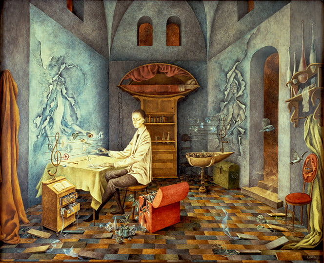 El tema de sus obras fue influenciado por la ciencia, el psicoanálisis y el misticismo, más que todo la alquimia, representando a las personas llevando a cabo labores de carácter simbólico y espiritual.