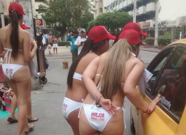 Presuntamente un candidato a la presidencia de Colombia utilizó recientemente a un grupo de jóvenes en bikini para repartir propaganda política a su favor.